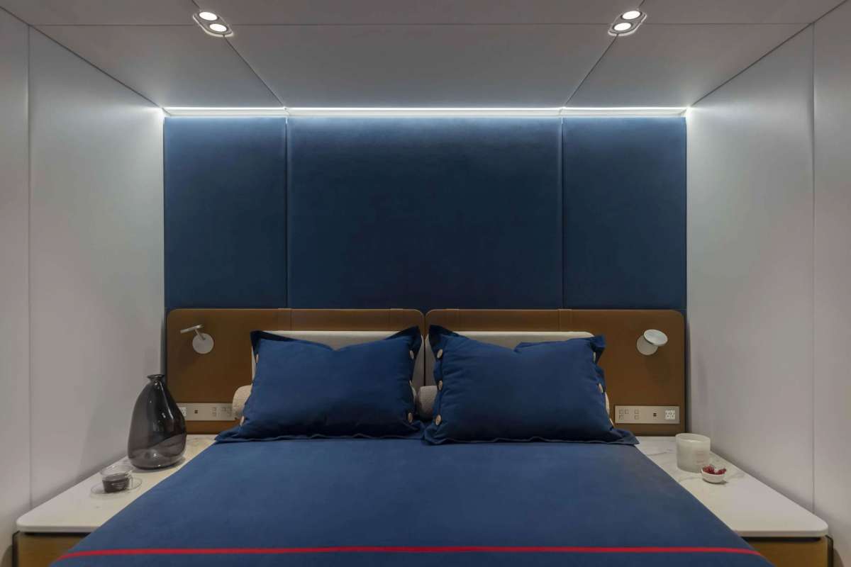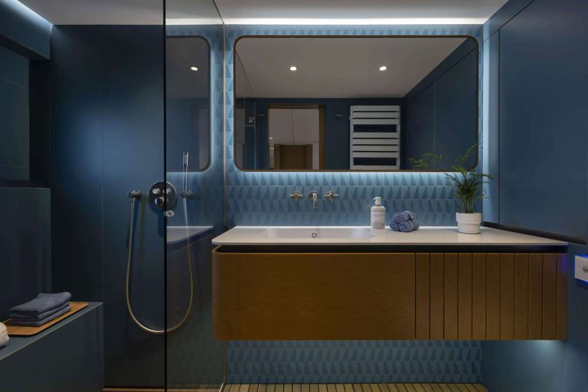 Call us (954) 980 9281The four guest cabins are thoughtfully arranged, with a spacious master suite with king berth in the port hull, a double midships cabin, a twin forward cabin, and an aft cabin featuring a double bed plus a Pullman in the starboard hull. Each cabin offers the comfort and privacy of ensuite facilities, with the master distinguished by striking azure blue tiling and an expansive shower cubicle. The remaining suites continue the theme, accented with touches of azure blue and clean, contemporary lines.